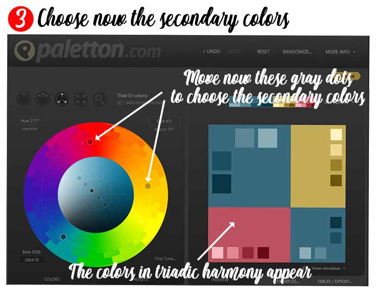 By clicking and moving the gray points of the color wheel, you choose your appropriate secondary colors ... To obtain a color harmony, the 3 points ont the color wheel must form an isosceles triangle... this harmony is perfect when it becomes equilateral.