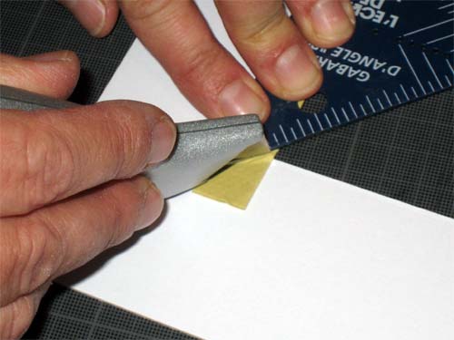 Place your strip, turn the mat over and adjust the overhang by sliding the strip on the fresh glue: use the small groove drawn earlier.