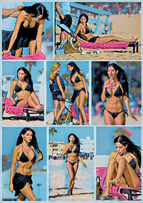 For me, I searched on the net for pictures of our national bimbo Nabilla, shot in a mini black swimsuit on a beach in California... With the intention of creating one or two comic book pages ... Here is part of the result of my research: