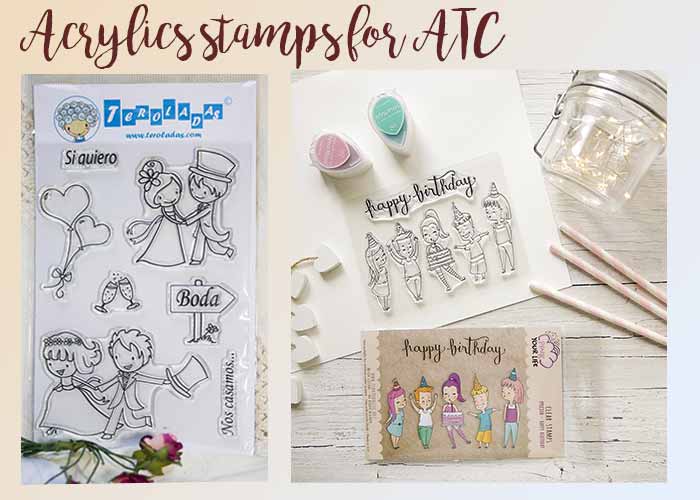 Transparencies or acrylic stamps: They are self-adhesive. Again you need an acrylic block. Their transparency allows you to easily see where you stamp. Inexpensive and sold in plate of several ones, they increase very rapidly your collection.