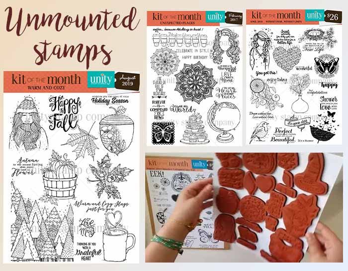 The unmounted stamps: They are practical because they take small space but they are nevertheless more difficult to use. You need to bring an acrylic block and Ez-Mount (foam with adhesive backing or another electrostatic).