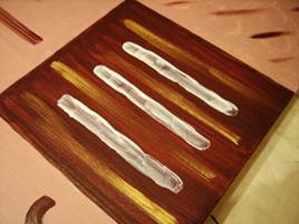 Paint 3 squares dark brown and try to create different effects with the brush (tapped, smoothed, twisted). Apply strokes of gold paint on dark brown without waiting for it to dry.