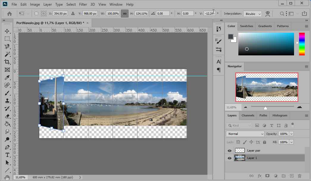 It is a panoramic view of Port Navalo (Morbihan - Bretagne) which was obtained by combining 3 pictures using the "Photomerge" : File> Automate> Photomerge... (The results of the new and improved Photomerge are remarkably good).